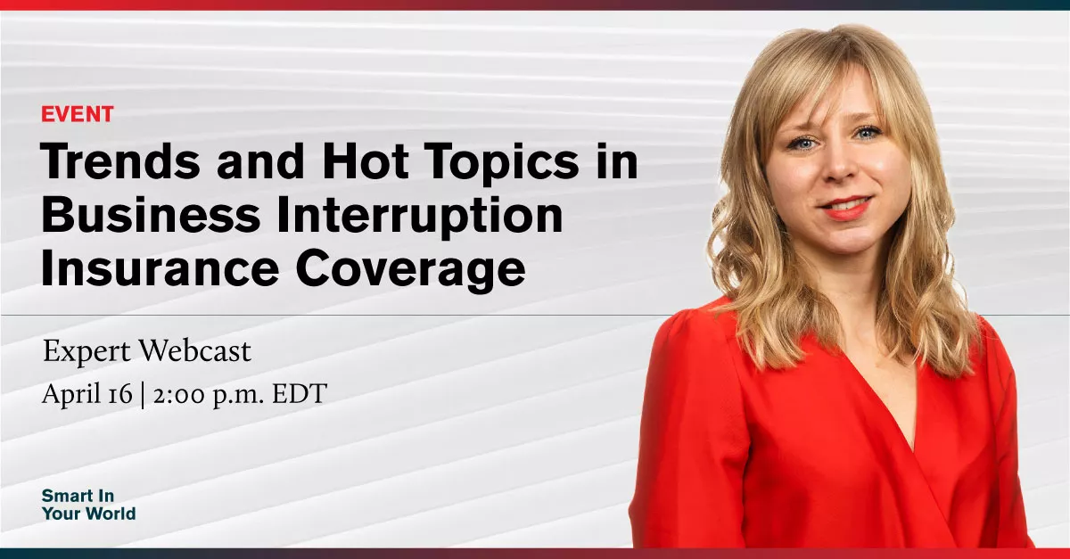 ArentFox Schiff Associate Anna Mandel will be speaking on Expert Webcast’s upcoming Trends and Hot Topics in Business Interruption Insurance Coverage panel.
