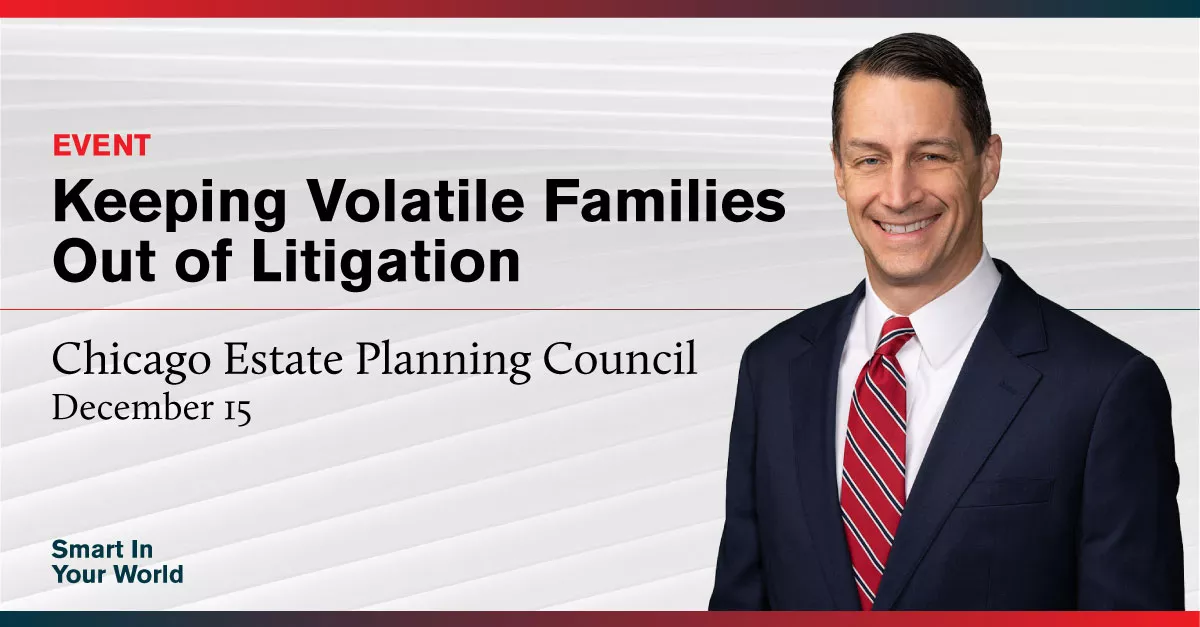 Dave and his co-presenter will speak at the monthly Chicago Estate Planning Council meeting. They will discuss many of the ways family conflicts and challenges can complicate trust and estate administration, and they will describe best practices to avoid these situations or minimize their impact.